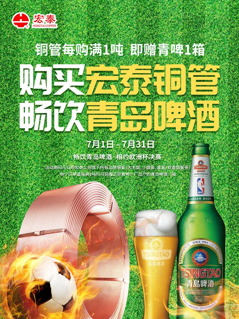 7月1日至7月31日期間,凡訂購宏泰公司旗下所有品牌銅管(大木盤、小盤管、直管、蚊香盤管等)的客戶,單個訂單量每滿1噸,即可獲贈青啤一廠生產(chǎn)的青島啤酒一箱!