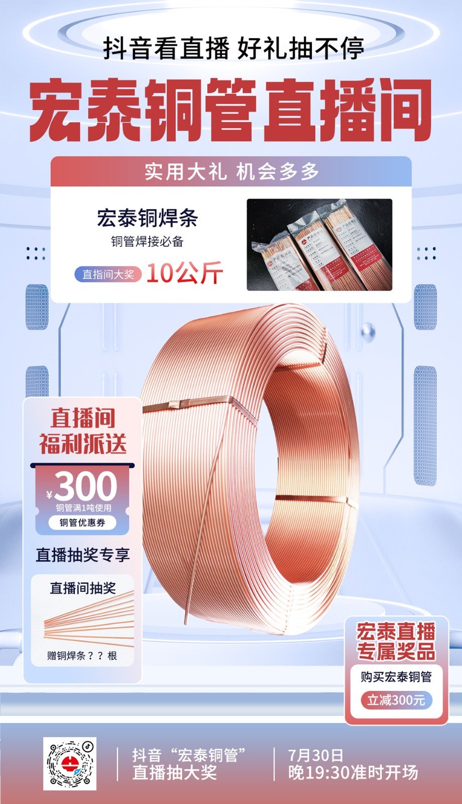 每周五晚19:30,宏泰銅管準(zhǔn)時(shí)開(kāi)啟直播,全程不定時(shí)抽獎(jiǎng),我們?yōu)榇蠹覝?zhǔn)備了豐富的獎(jiǎng)品,還有驚喜大獎(jiǎng)——10公斤銅焊條和300元銅管優(yōu)惠券等好禮等您來(lái)拿!呼朋喚友一起來(lái),中獎(jiǎng)幾率翻倍哦!掃描上圖二維碼預(yù)約~我們直播見(jiàn)!