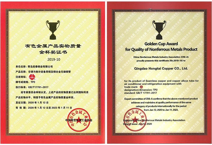 2019年10月至12月,中國(guó)有色金屬工業(yè)協(xié)會(huì)專家委員會(huì)對(duì)青島宏泰銅業(yè)有限公司申報(bào)的空調(diào)與制冷設(shè)備用銅及銅合金無縫管進(jìn)行實(shí)地審核和答疑。經(jīng)專家委員會(huì)審核認(rèn)定:青島宏泰銅業(yè)有限公司申報(bào)的空調(diào)與制冷設(shè)備用銅及銅合金無縫管的實(shí)物質(zhì)量達(dá)到了國(guó)際同類產(chǎn)品實(shí)物質(zhì)量,特授予有色金屬產(chǎn)品實(shí)物質(zhì)量金杯獎(jiǎng)。