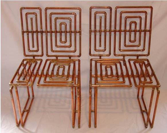 銅管桌子說(shuō)完了,再說(shuō)說(shuō)椅子,看到上圖,各位讀者未免懷疑這板凳的穩(wěn)定性,如果你親自用手彎一下外徑35mm,壁厚且2mm的銅管,相信你再也不會(huì)擔(dān)心這板凳的承重能力,銅管可按照自己的想法切割,但是事先得設(shè)計(jì)好圖紙,用銅管設(shè)計(jì)最重要的是要考慮連接處的穩(wěn)定性,以銀焊條焊接可以很好的保證連接處的穩(wěn)定性,以上的板凳如果讀者對(duì)靠背的牢固程度擔(dān)憂,可在椅面與椅背之間加一根支撐,利用三角形的穩(wěn)定性,也可在椅面與椅背之見(jiàn)做一個(gè)矩形的扶手,實(shí)用也不影響美觀。